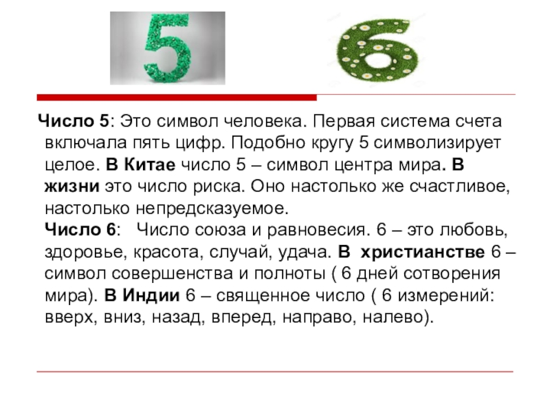 пять цифр. Подобно кругу 5 символизирует целое. В Китае число 5 – символ центра мира. В жизни это число риска. Оно настолько же счастливое, настолько непредсказуемое. Число 6: Число союза и равновесия. 6 – это любовь, здоровье, красота, случай, удача. В христианстве 6 – символ совершенства и полноты ( 6 дней сотворения мира). В Индии 6 – священное число ( 6 измерений: вверх, вниз, назад, вперед, направо, налево).