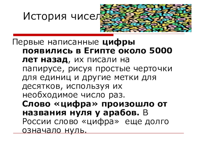 их писали на папирусе, рисуя простые черточки для единиц и другие метки для десятков, используя их необходимое число раз. Слово «цифра» произошло от названия нуля у арабов. В России слово «цифра» еще долго означало нуль.