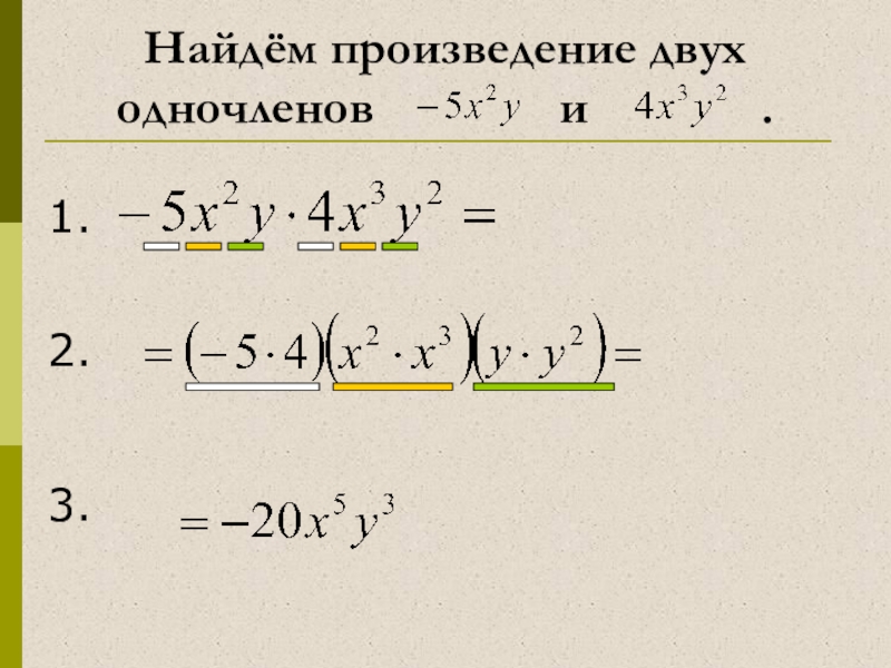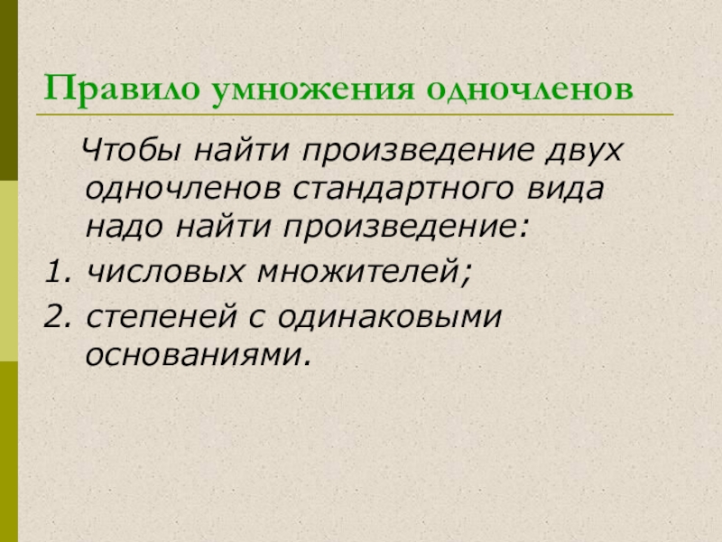 Правило умножения одночленов	Чтобы найти произведение двух одночленов стандартного вида надо найти произведение:1. числовых множителей;2. степеней с одинаковыми