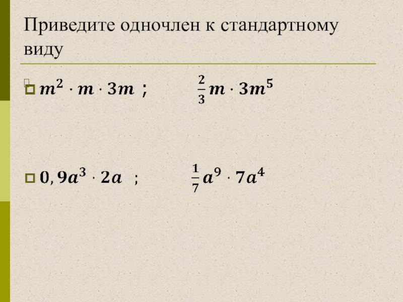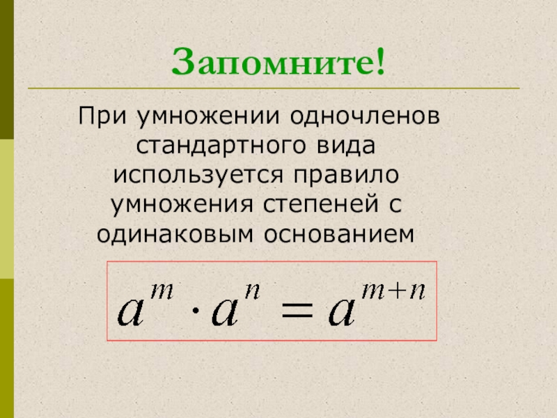 Запомните!	При умножении одночленов стандартного вида используется правило умножения степеней с одинаковым основанием