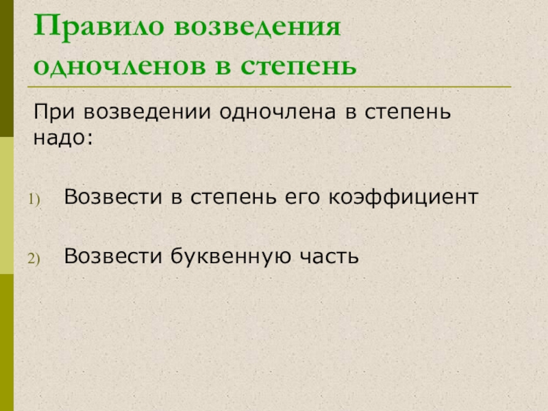 Правило возведения одночленов в степеньПри возведении одночлена в степень надо:Возвести в степень его коэффициентВозвести буквенную часть