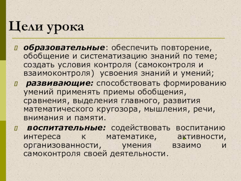Цели урокаобразовательные: обеспечить повторение, обобщение и систематизацию знаний по теме; создать условия контроля (самоконтроля и взаимоконтроля) усвоения знаний и умений; развивающие: способствовать формированию умений применять приемы обобщения, сравнения, выделения главного, развития математического кругозора, мышления, речи, внимания