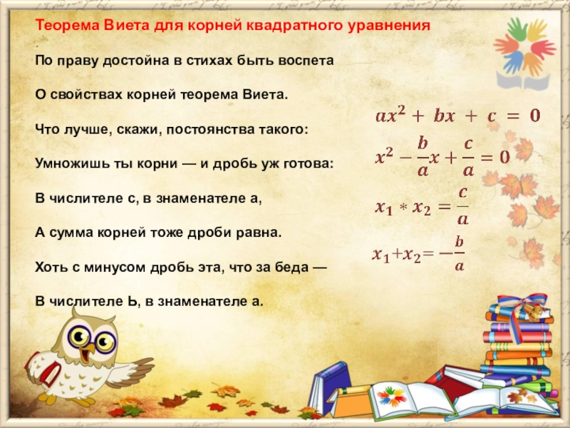 быть воспета О свойствах корней теорема Виета. Что лучше, скажи, постоянства такого: Умножишь ты корни — и дробь уж готова: В числителе с, в знаменателе а, А сумма корней тоже дроби равна. Хоть с минусом дробь эта, что за беда — В числителе Ь, в знаменателе а.