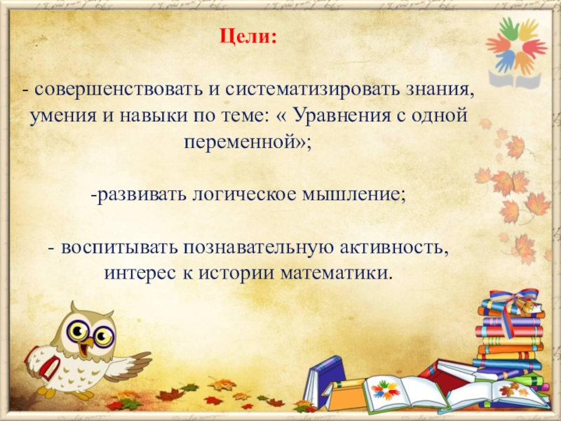 Цели: - совершенствовать и систематизировать знания, умения и навыки по теме: « Уравнения с одной переменной»; -развивать логическое мышление; - воспитывать познавательную активность, интерес к истории математики.