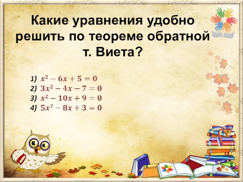 Слайд 16Какие уравнения удобно решить по теореме обратной т. Виета?