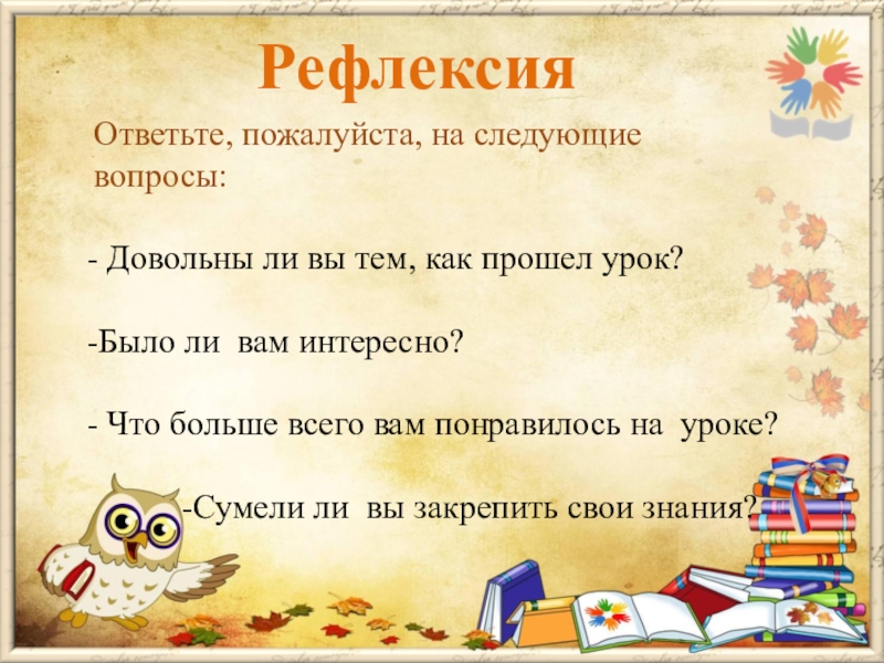 РефлексияОтветьте, пожалуйста, на следующие вопросы: - Довольны ли вы тем, как прошел урок? -Было ли вам интересно?