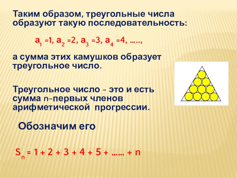 Треугольное число - это и есть сумма n-первых членов арифметической прогрессии.