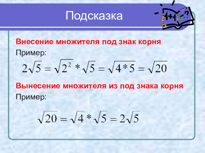 «Вынести множители!» — приказала королева. И обратилась к королю: « Ваше величество, Вы же видите, что радикалы в таком состоянии, что из-под них надо вынести множители, а потом сложить».