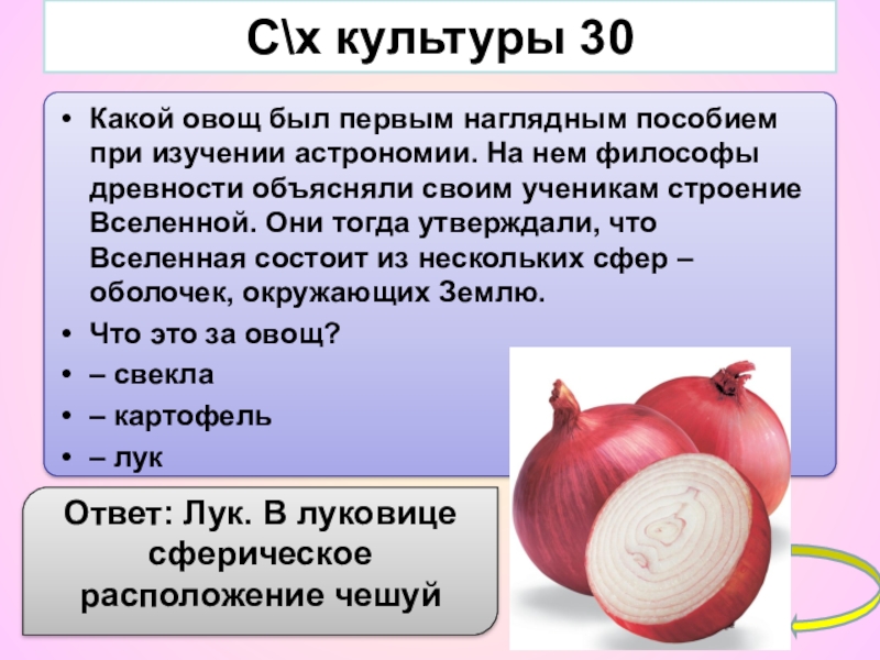 Ответ: Лук. В луковице сферическое расположение чешуй