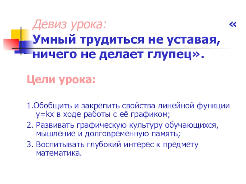 1.Обобщить и закрепить свойства линейной функции у=kх в ходе работы с её графиком;