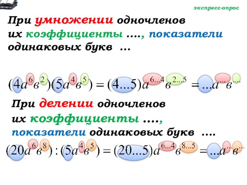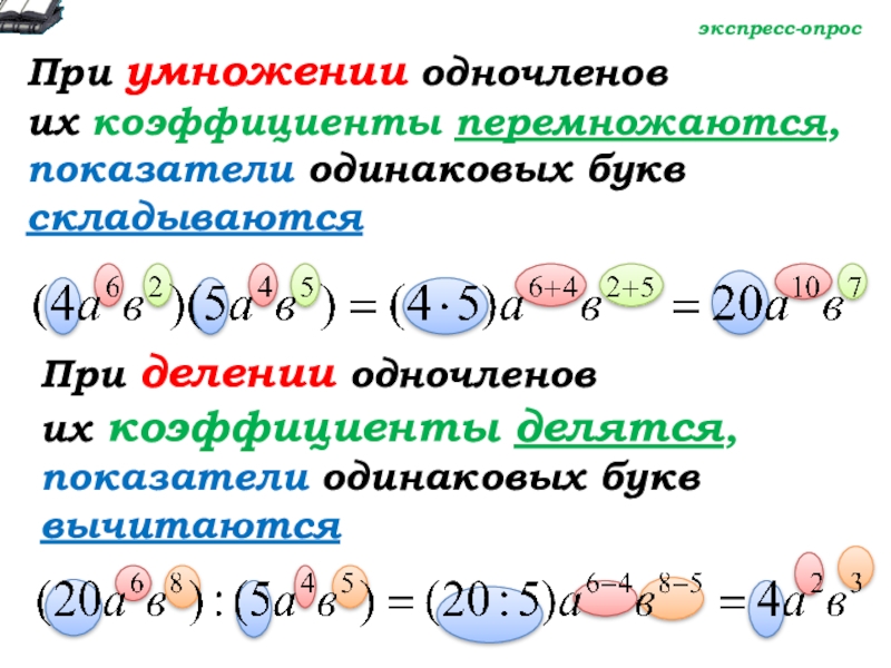 их коэффициенты перемножаются, показатели одинаковых букв складываются