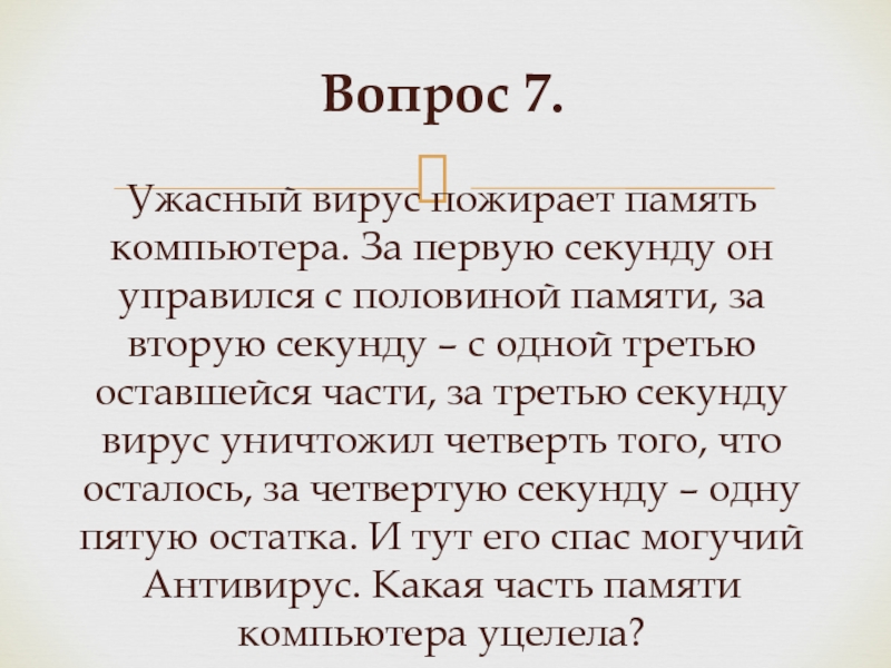Слайд 14Вопрос 7. Ужасный вирус пожирает память компьютера. За первую секунду он управился