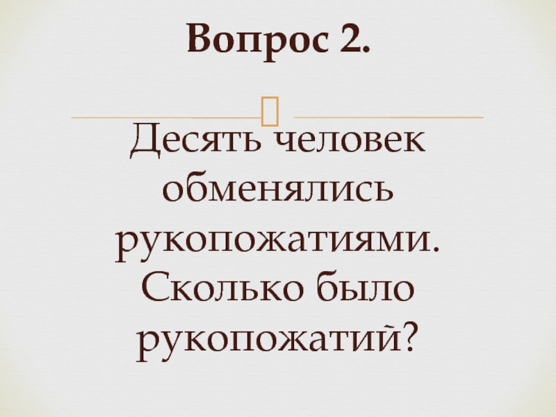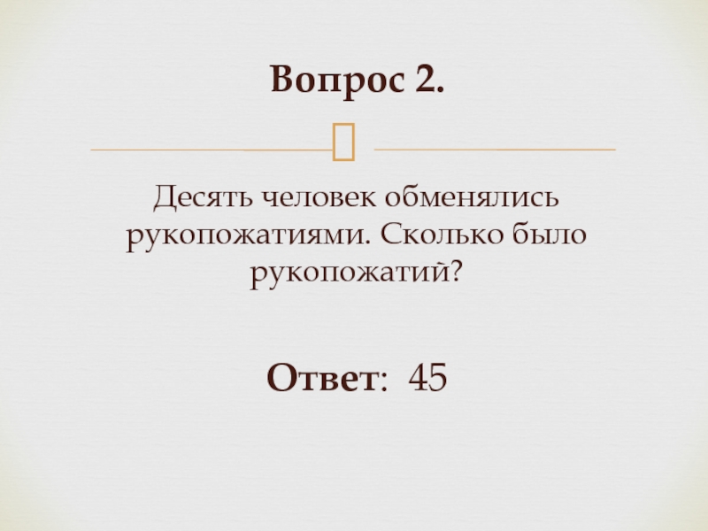 Слайд 4Вопрос 2. Десять человек обменялись рукопожатиями. Сколько было рукопожатий?