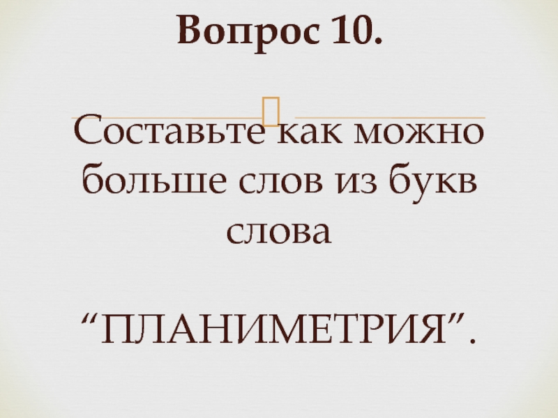 Слайд 19Вопрос 10. Составьте как можно больше слов из букв слова “ПЛАНИМЕТРИЯ”.