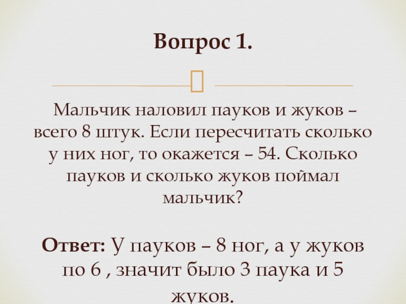 Вопрос 1.    Мальчик наловил пауков и жуков – всего 8 штук. Если пересчитать сколько