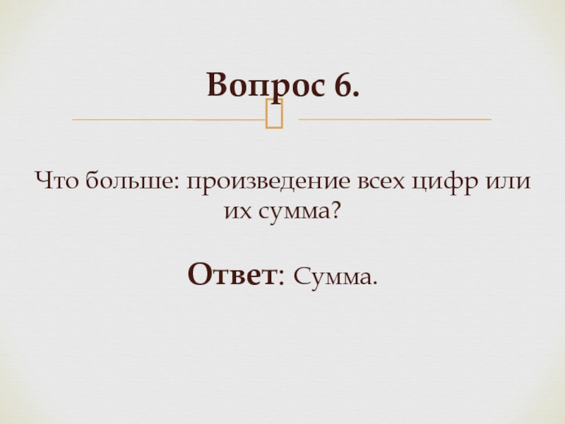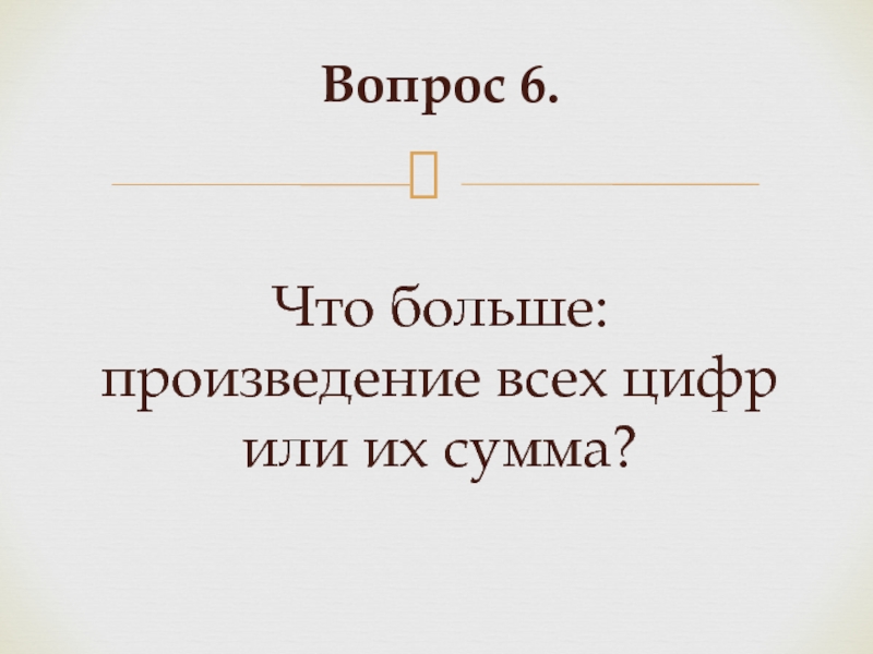 Слайд 12Вопрос 6. Что больше: произведение всех цифр или их сумма?