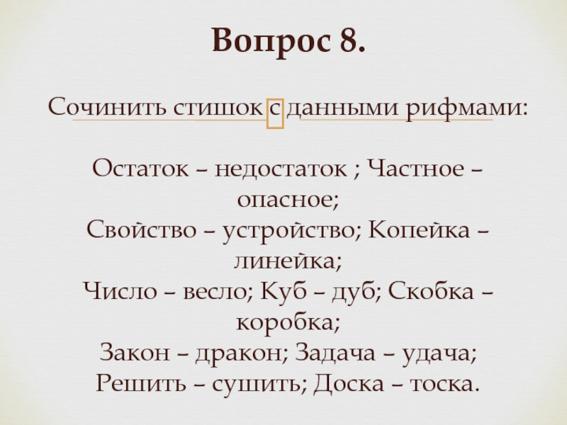 Слайд 16Вопрос 8. Сочинить стишок с данными рифмами: Остаток – недостаток ; Частное –