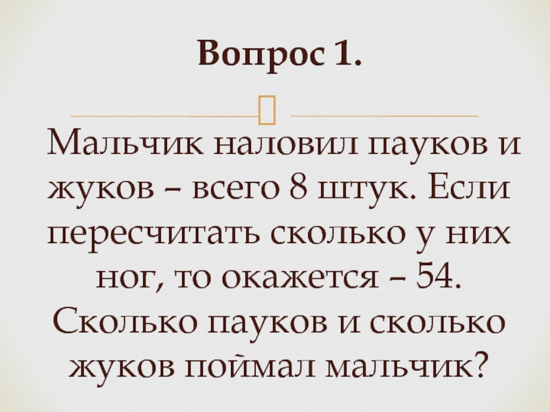 Вопрос 1. Мальчик наловил пауков и жуков – всего 8 штук. Если пересчитать сколько у них ног, то окажется – 54. Сколько пауков и сколько жуков поймал мальчик?