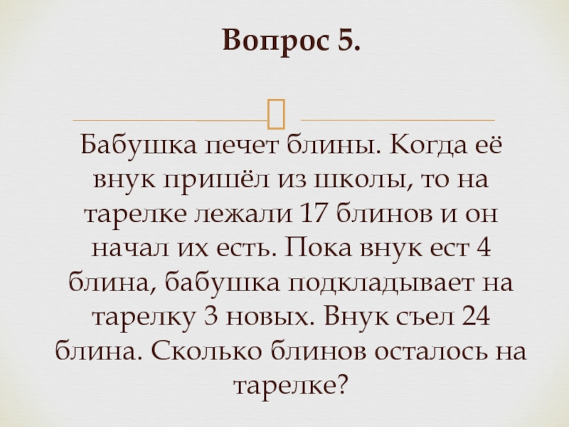 Слайд 10Вопрос 5. Бабушка печет блины. Когда её внук пришёл из школы, то