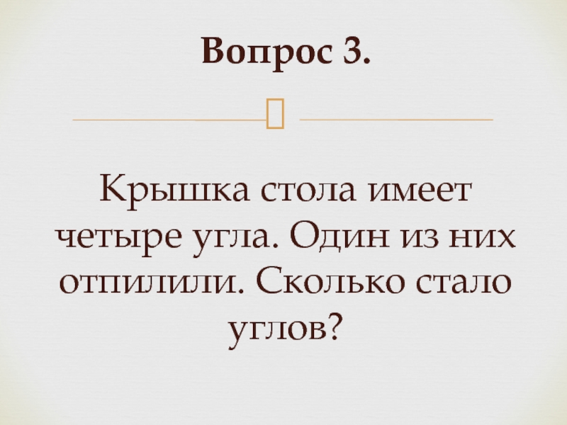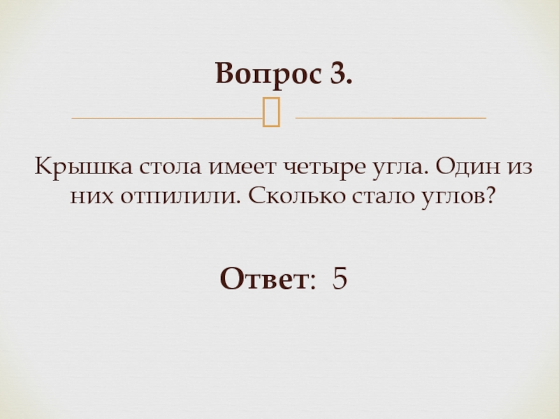 Слайд 6Вопрос 3. Крышка стола имеет четыре угла. Один из них отпилили. Сколько