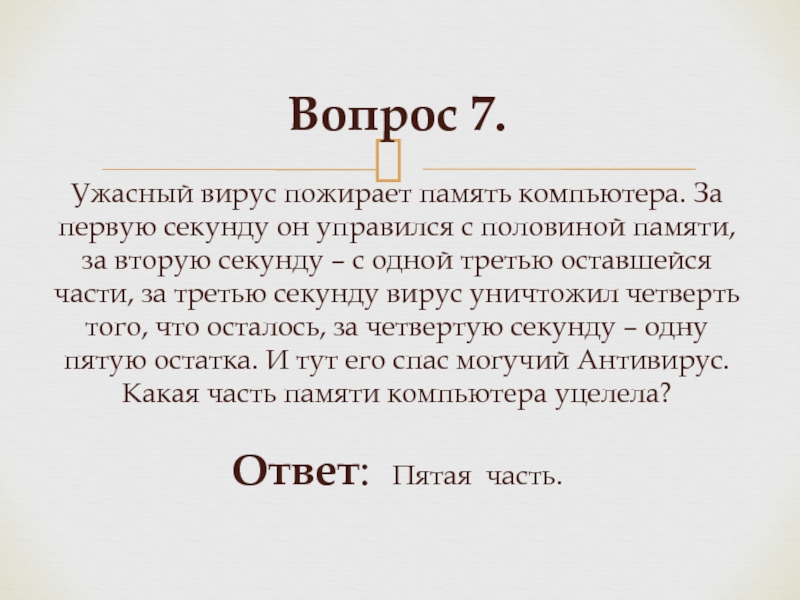 с половиной памяти, за вторую секунду – с одной третью оставшейся части, за третью секунду вирус уничтожил четверть того, что осталось, за четвертую секунду – одну пятую остатка. И тут его спас могучий Антивирус. Какая часть памяти компьютера уцелела? Ответ: Пятая часть.