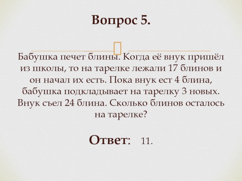 Слайд 11Вопрос 5. Бабушка печет блины. Когда её внук пришёл из школы, то