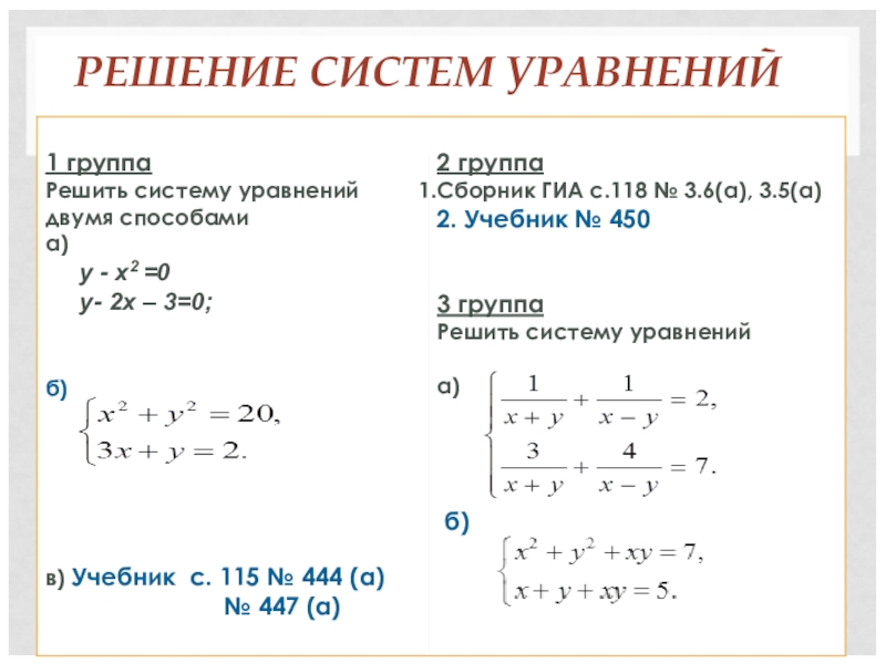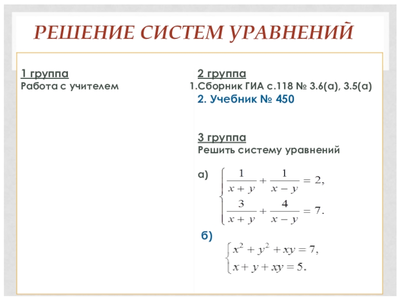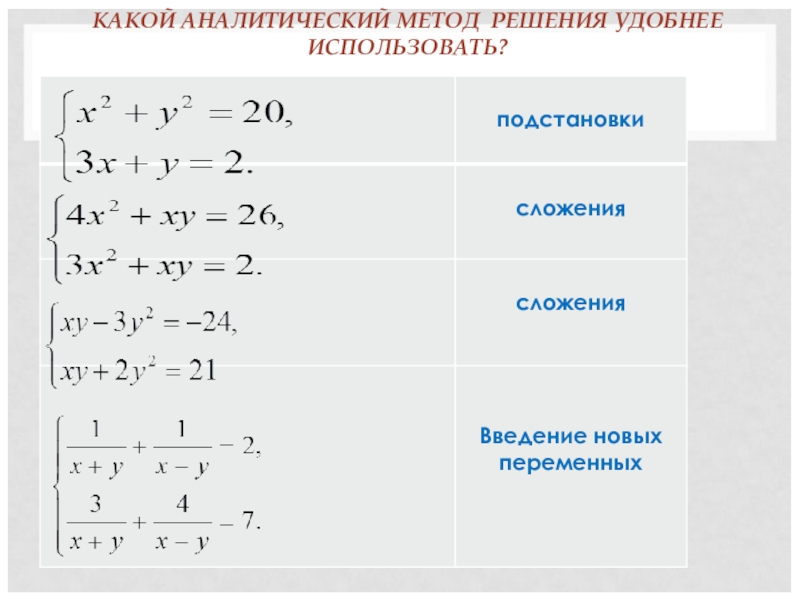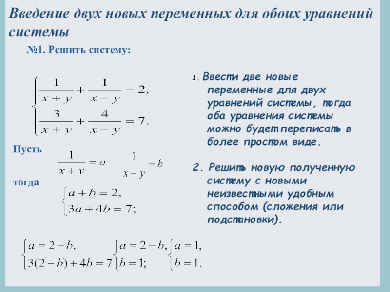 1. Ввести две новые переменные для двух уравнений системы, тогда оба уравнения системы можно будет переписать в более простом виде.