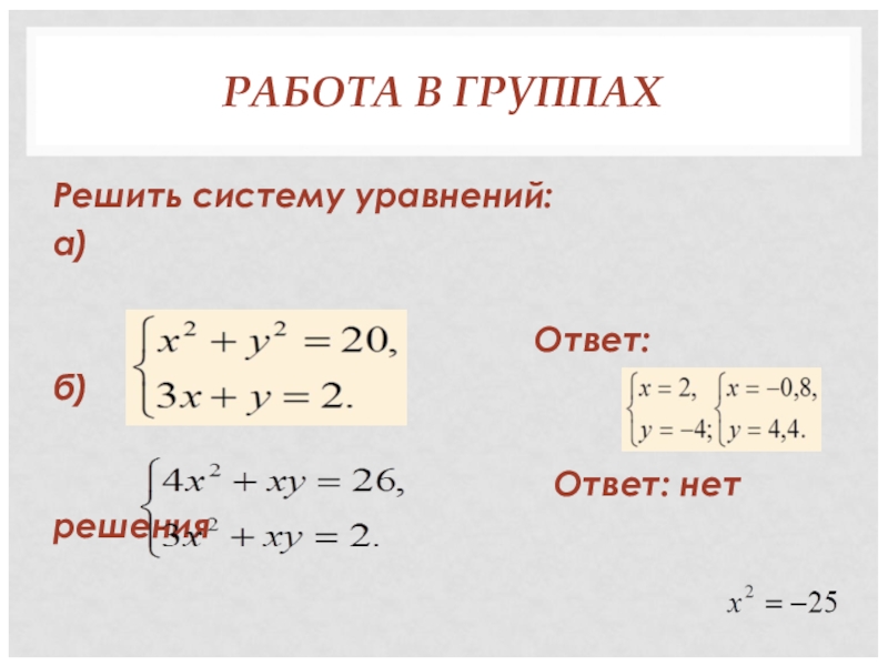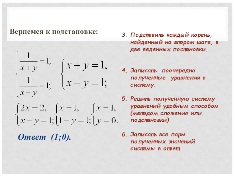 3. Подставить каждый корень, найденный на втором шаге, в две веденных постановки.