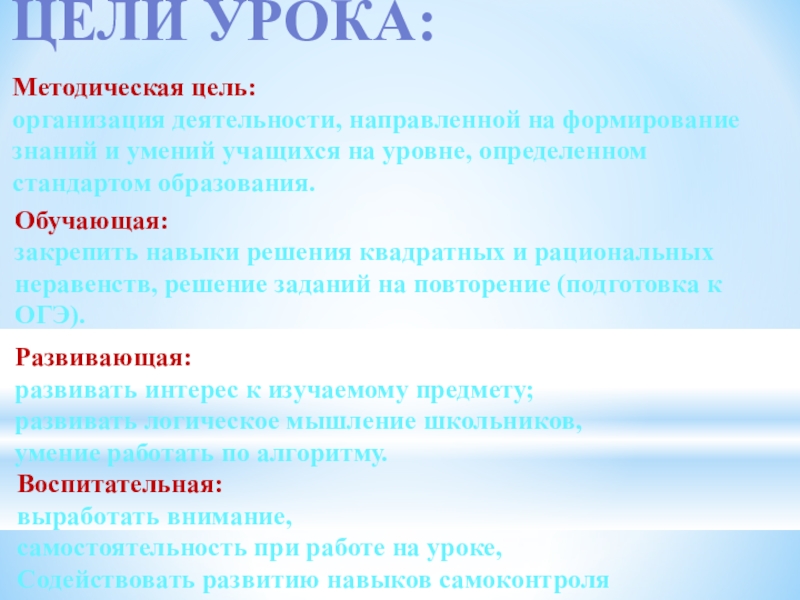 закрепить навыки решения квадратных и рациональных неравенств, решение заданий на повторение (подготовка к ОГЭ).