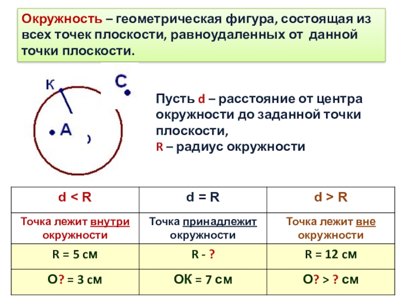Пусть d – расстояние от центра окружности до заданной точки плоскости,