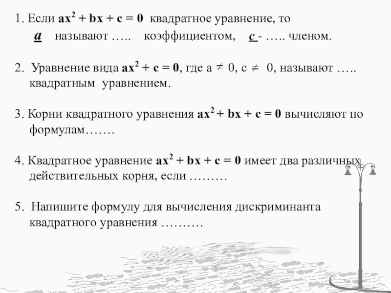 5. Напишите формулу для вычисления дискриминанта квадратного уравнения ……….