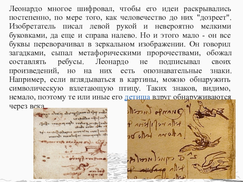 Слайд 15Леонардо многое шифровал, чтобы его идеи раскрывались постепенно, по мере того,