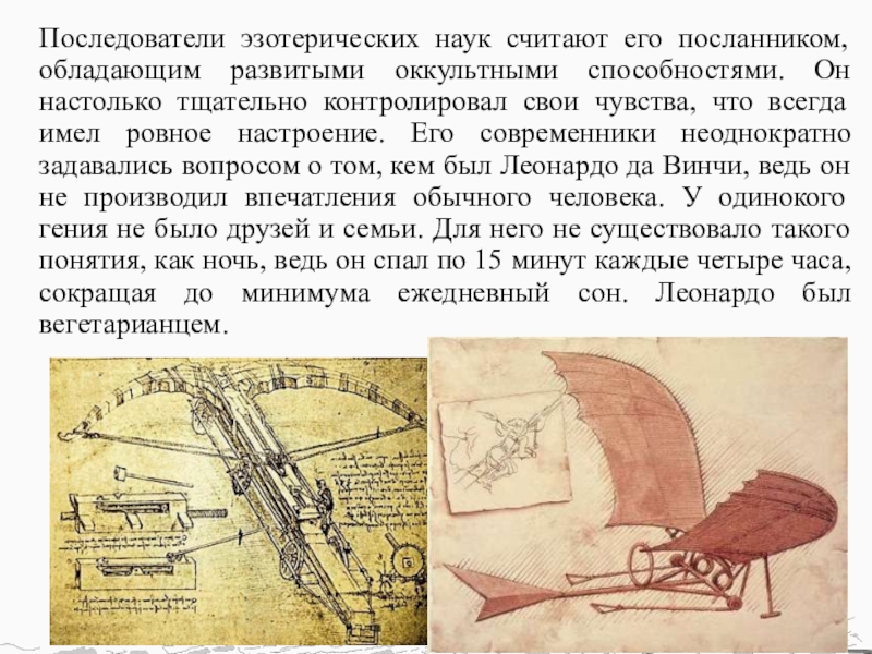 настолько тщательно контролировал свои чувства, что всегда имел ровное настроение. Его современники неоднократно задавались вопросом о том, кем был Леонардо да Винчи, ведь он не производил впечатления обычного человека. У одинокого гения не было друзей и семьи. Для него не существовало такого понятия, как ночь, ведь он спал по 15 минут каждые четыре часа, сокращая до минимума ежедневный сон. Леонардо был вегетарианцем.