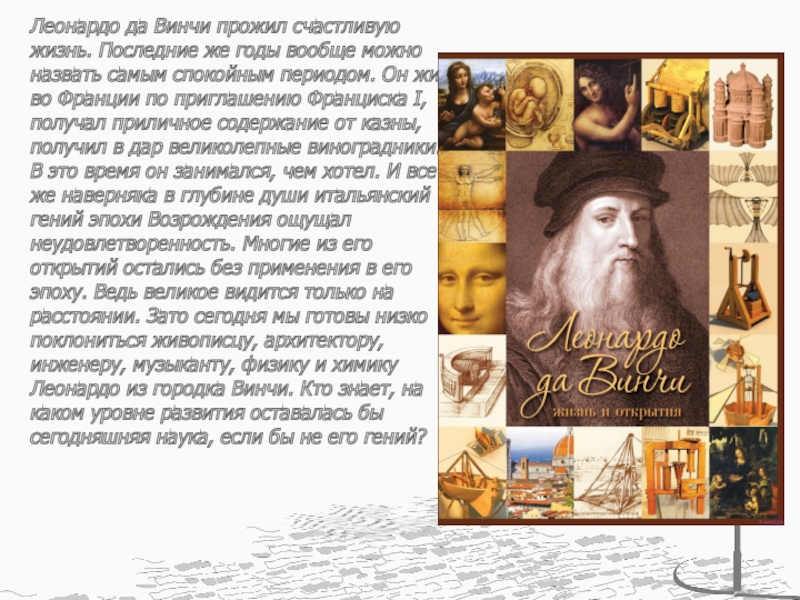 Слайд 17Леонардо да Винчи прожил счастливую жизнь. Последние же годы вообще можно