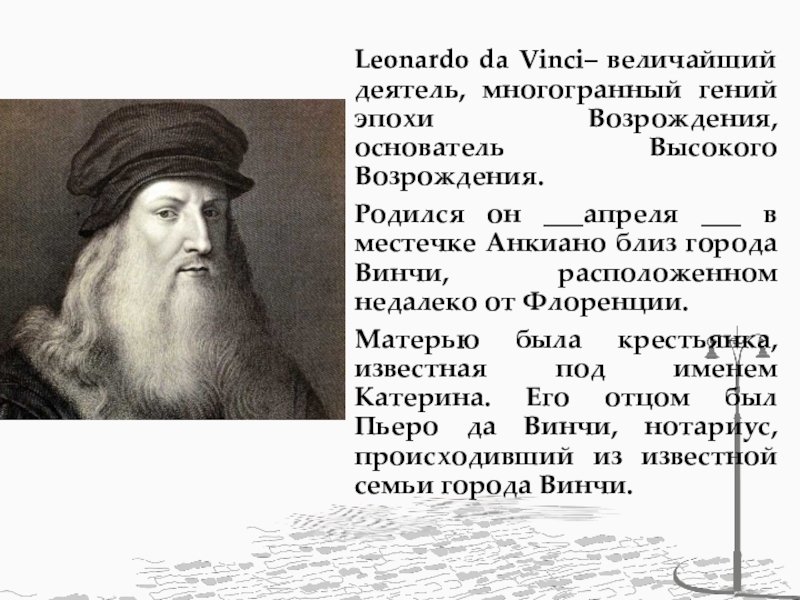 Родился он ___апреля ___ в местечке Анкиано близ города Винчи, расположенном недалеко от Флоренции.