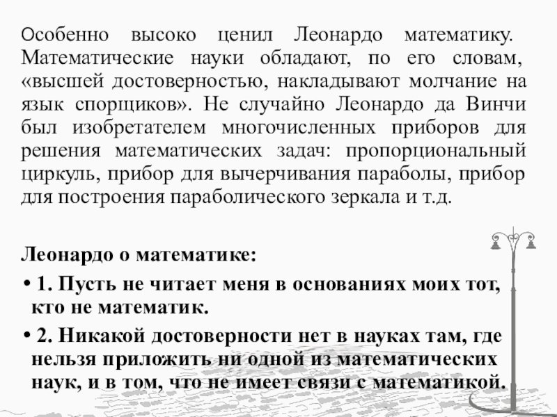Слайд 8Особенно высоко ценил Леонардо математику. Математические науки обладают, по его словам,
