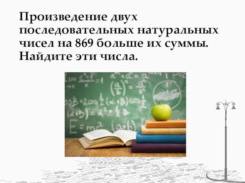 Слайд 16Произведение двух последовательных натуральных чисел на 869 больше их суммы. Найдите