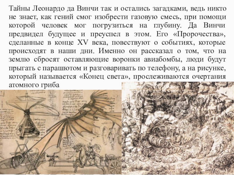 знает, как гений смог изобрести газовую смесь, при помощи которой человек мог погрузиться на глубину. Да Винчи предвидел будущее и преуспел в этом. Его «Пророчества», сделанные в конце XV века, повествуют о событиях, которые происходят в наши дни. Именно он рассказал о том, что на землю сбросят оставляющие воронки авиабомбы, люди будут прыгать с парашютом и разговаривать по телефону, а на рисунке, который называется «Конец света», прослеживаются очертания атомного гриба