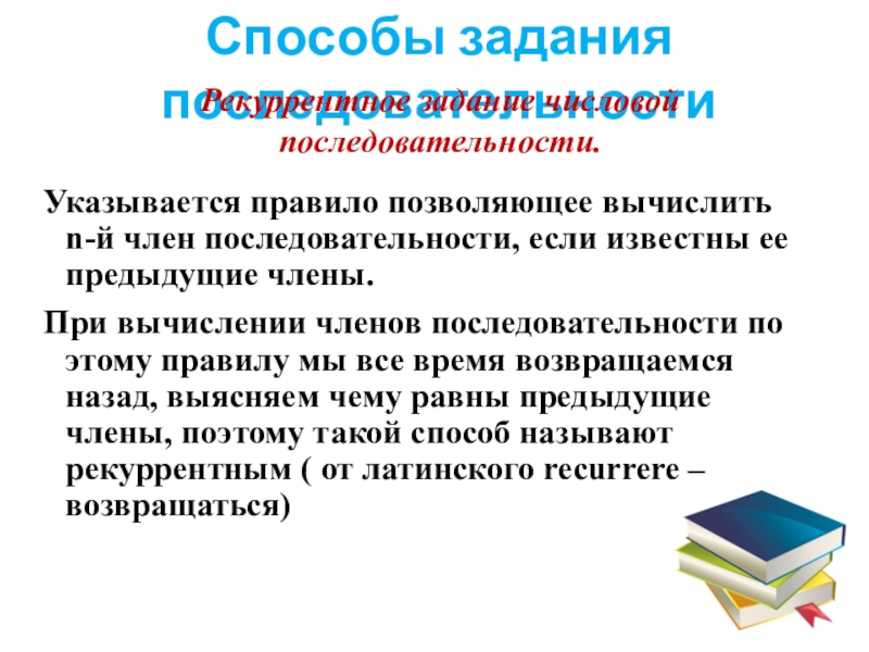 При вычислении членов последовательности по этому правилу мы все время возвращаемся назад, выясняем чему равны предыдущие члены, поэтому такой способ называют рекуррентным ( от латинского recurrere – возвращаться)