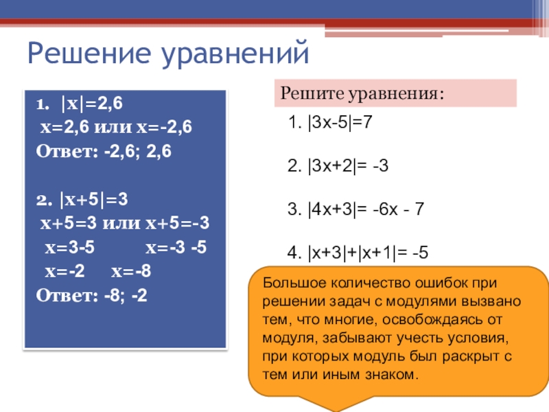 Большое количество ошибок при решении задач с модулями вызвано тем, что многие, освобождаясь от модуля, забывают учесть условия, при которых модуль был раскрыт с тем или иным знаком.