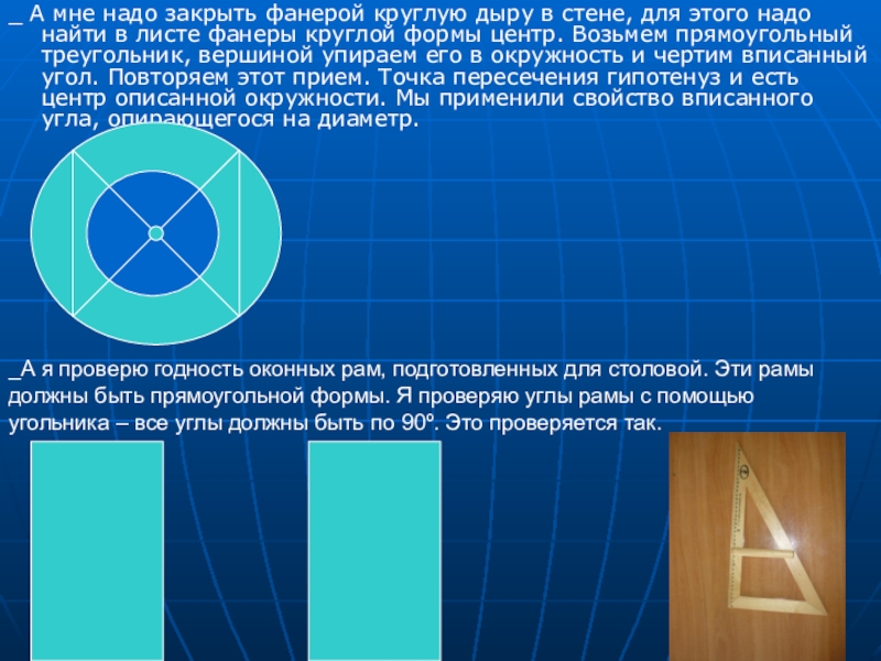 _А я проверю годность оконных рам, подготовленных для столовой. Эти рамы должны быть прямоугольной формы. Я проверяю углы рамы с помощью угольника – все углы должны быть по 90º. Это проверяется так.