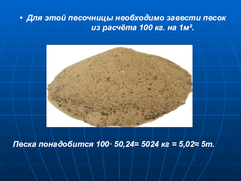 Песка понадобится 100· 50,24= 5024 кг = 5,02≈ 5т.