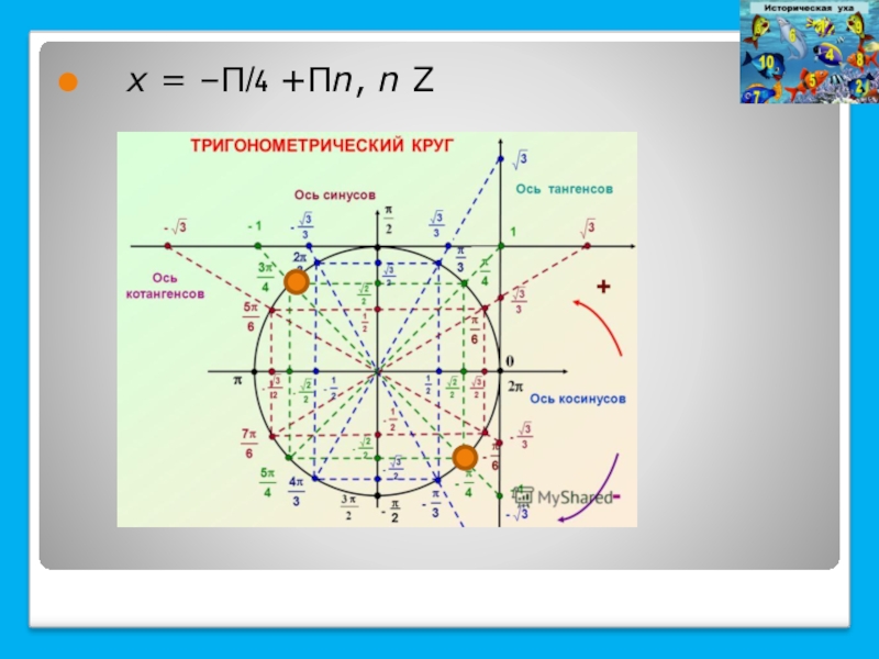 Слайд 14 х = –П/4 +Пn, n Z