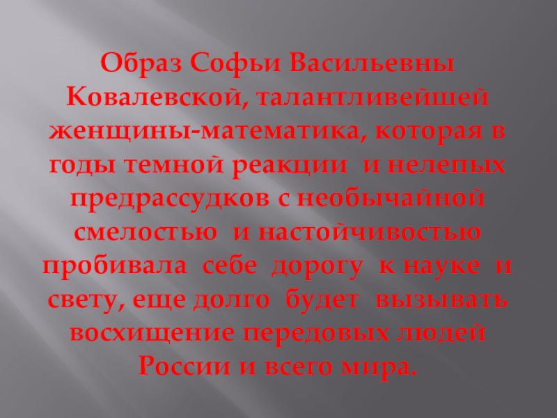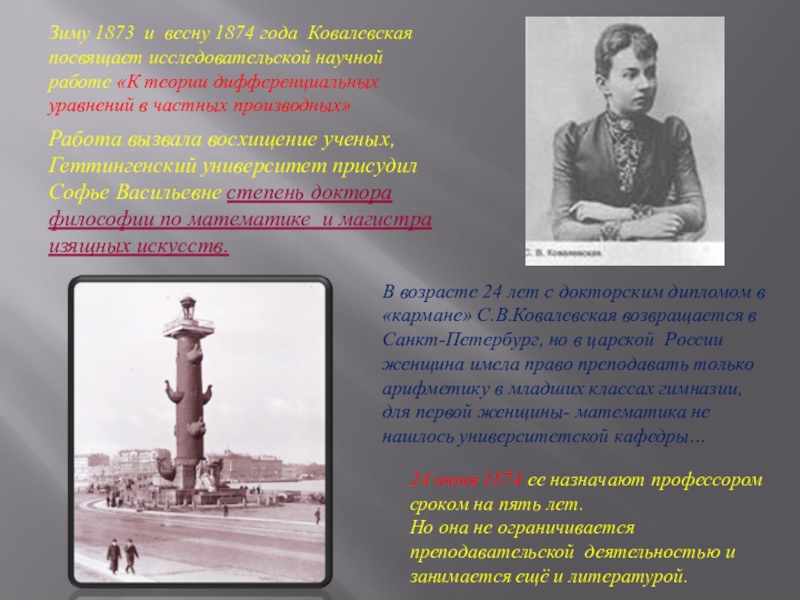 В возрасте 24 лет с докторским дипломом в «кармане» С.В.Ковалевская возвращается в Санкт-Петербург, но в царской России женщина имела право преподавать только арифметику в младших классах гимназии,