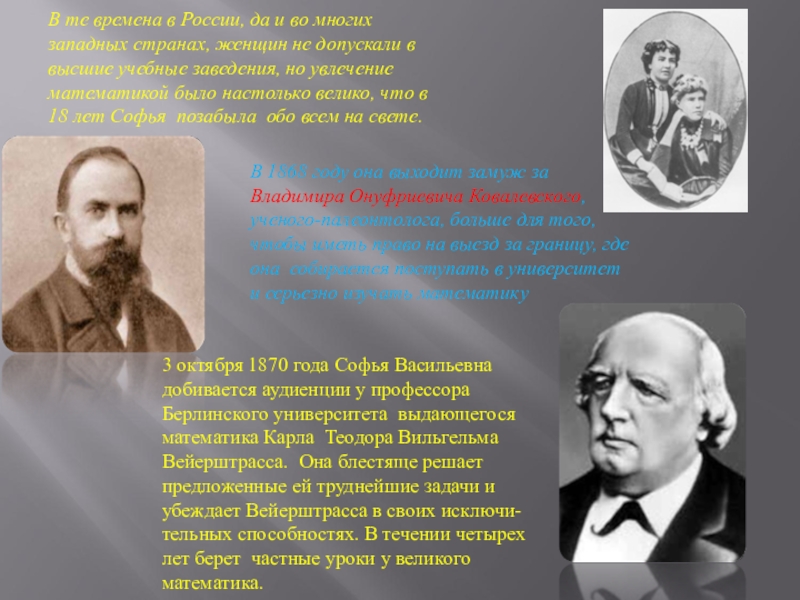 3 октября 1870 года Софья Васильевна добивается аудиенции у профессора Берлинского университета выдающегося математика Карла Теодора Вильгельма Вейерштрасса. Она блестяще решает предложенные ей труднейшие задачи и убеждает Вейерштрасса в своих исключи-тельных способностях. В течении четырех лет берет частные уроки у великого математика.