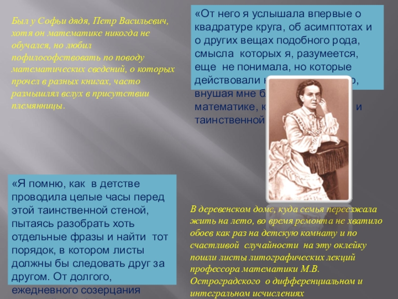 «От него я услышала впервые о квадратуре круга, об асимптотах и о других вещах подобного рода, смысла которых я, разумеется, еще не понимала, но которые действовали на мою фантазию, внушая мне благоговение к математике, как науке высшей и таинственной...»