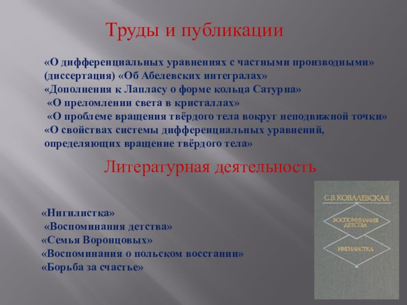 В 1888 г. Парижская академия наук присудила ей премию за исследование вращения твёрдого тела около неподвижной точки.