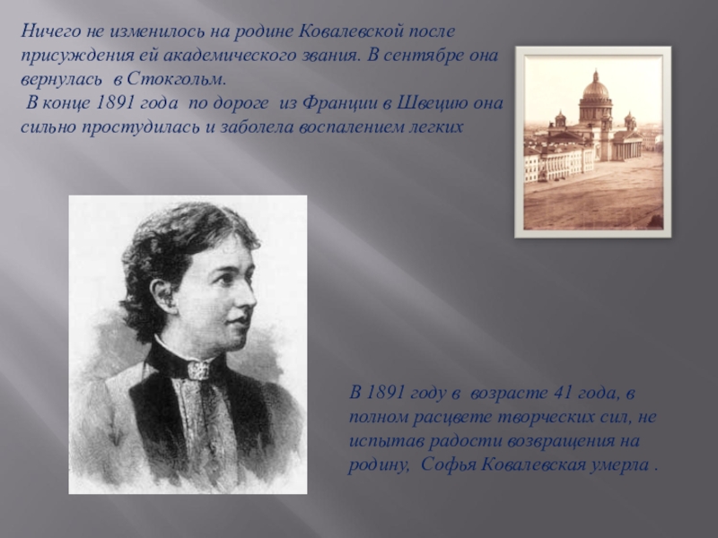 В 1891 году в возрасте 41 года, в полном расцвете творческих сил, не испытав радости возвращения на родину, Софья Ковалевская умерла .