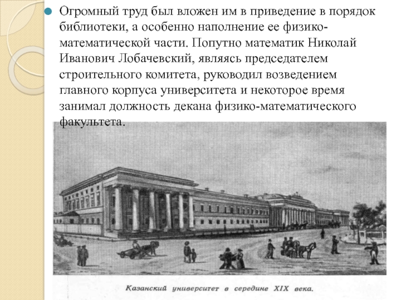 особенно наполнение ее физико-математической части. Попутно математик Николай Иванович Лобачевский, являясь председателем строительного комитета, руководил возведением главного корпуса университета и некоторое время занимал должность декана физико-математического факультета.