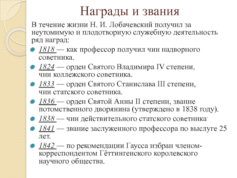 Награды и званияВ течение жизни Н. И. Лобачевский получил за неутомимую и плодотворную служебную деятельность ряд наград:1818 — как профессор